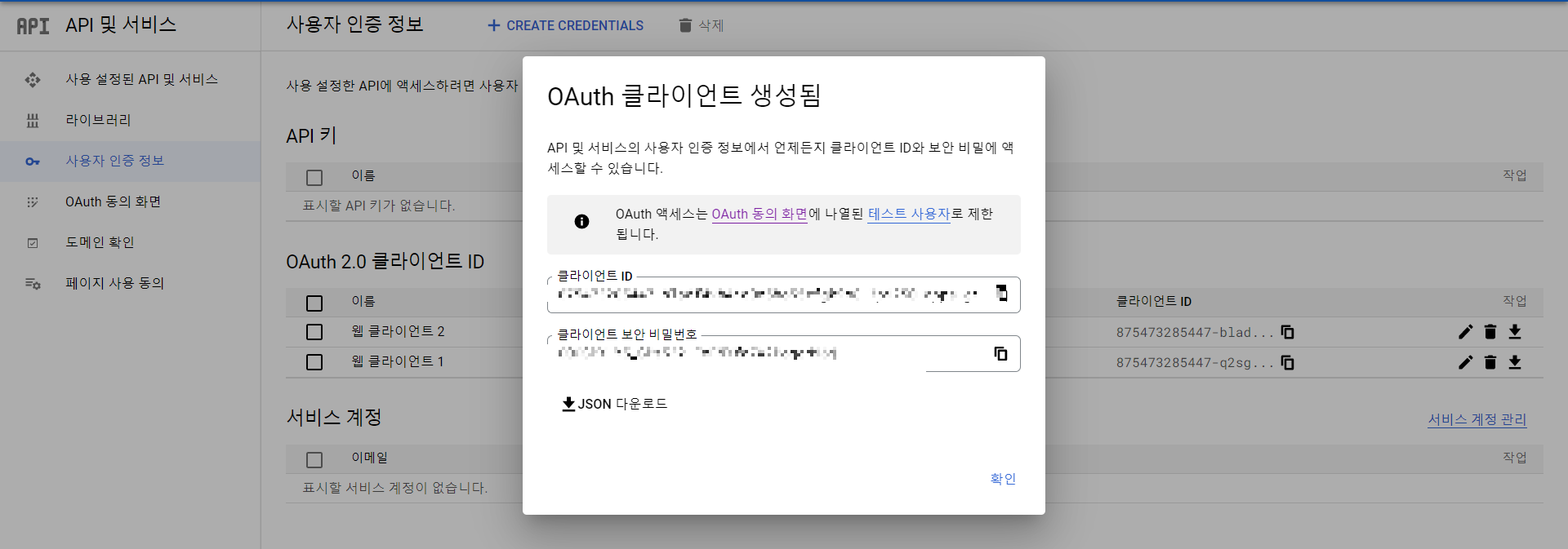 만들기를 클릭하면 클라이언트가 생성이 되면서 id와 비밀번호를 보여주는데 이를 기억해놔야 한다.
