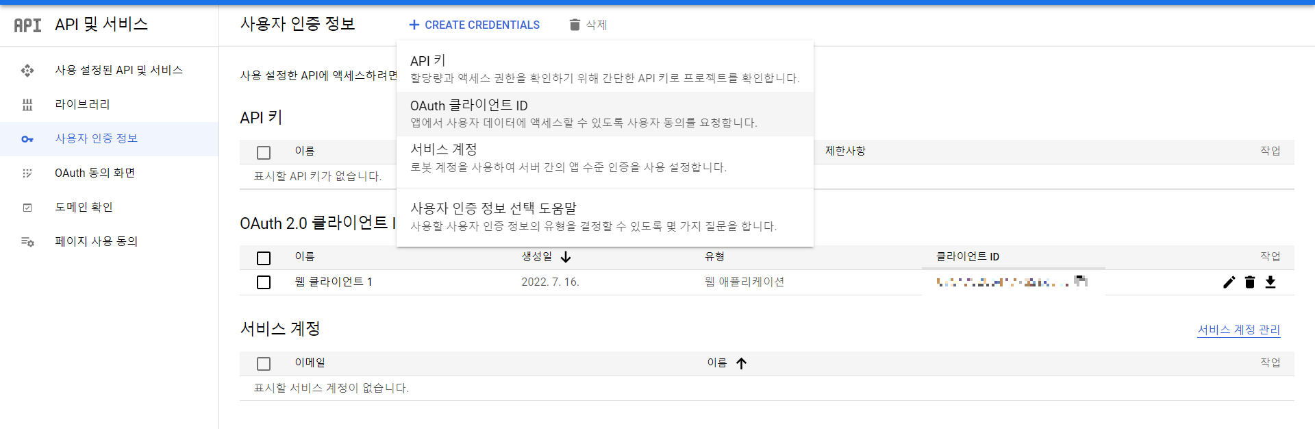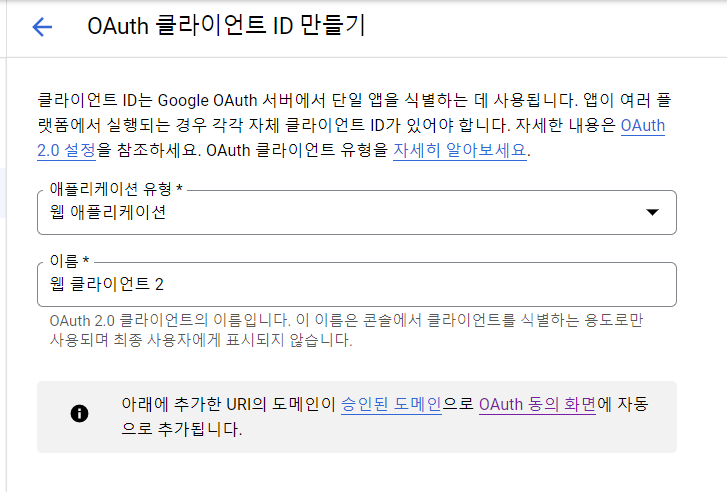 위쪽에 있는 + 버튼에서 Oauth 클라이언트 아이디 만들기를 클릭한다.