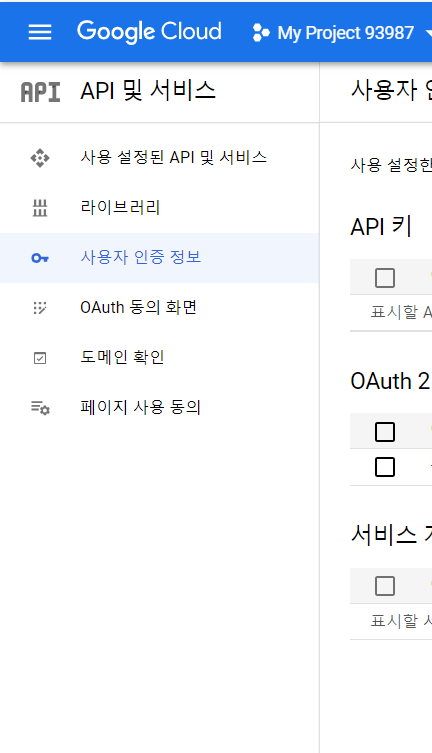 API 및 서비스를 클릭한다. 클릭 후 진입하는 화면에서 좌측에 있는 부분에서 사용자 인증 및 정보를 클릭한다.